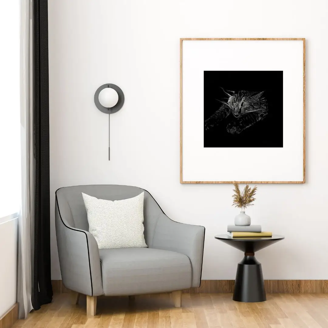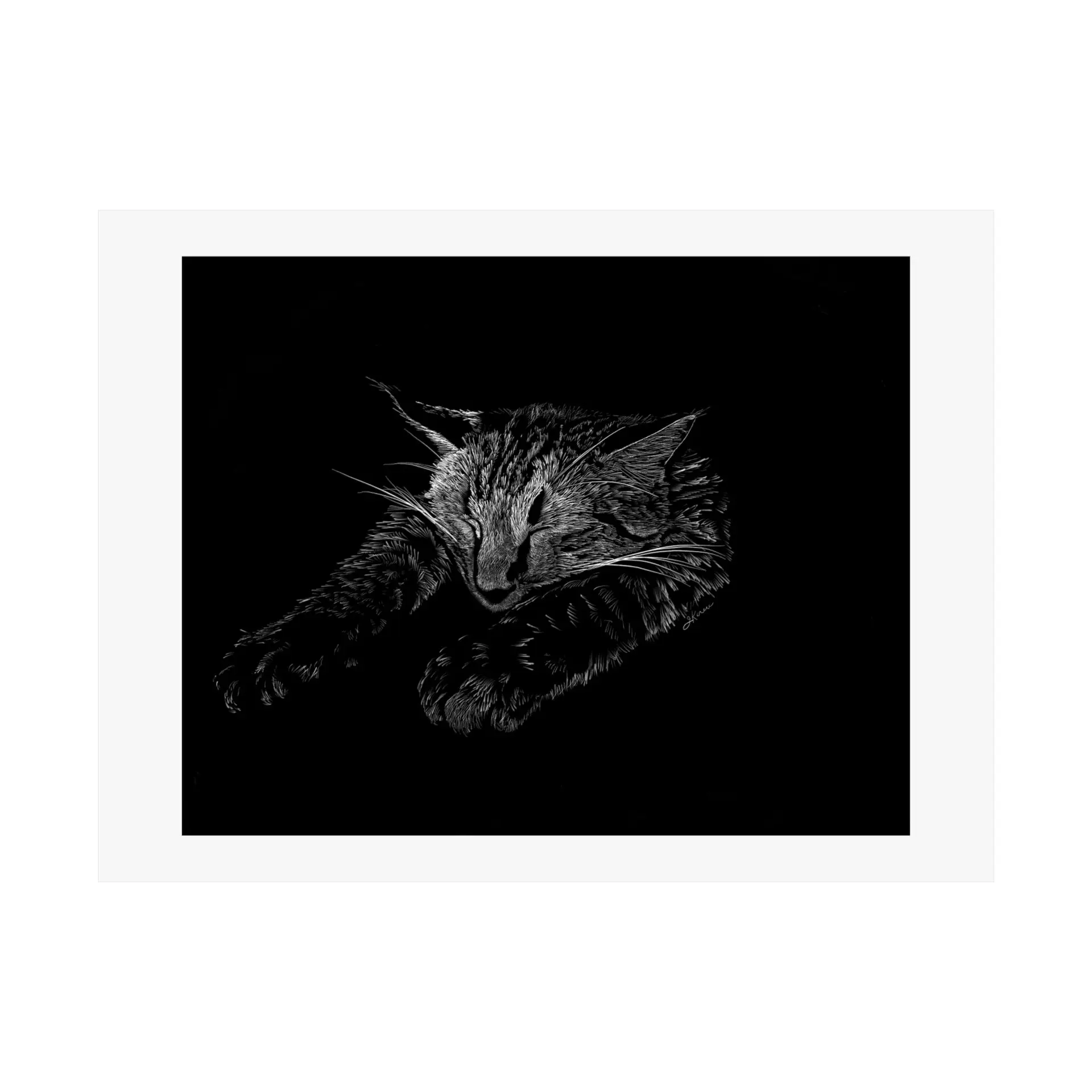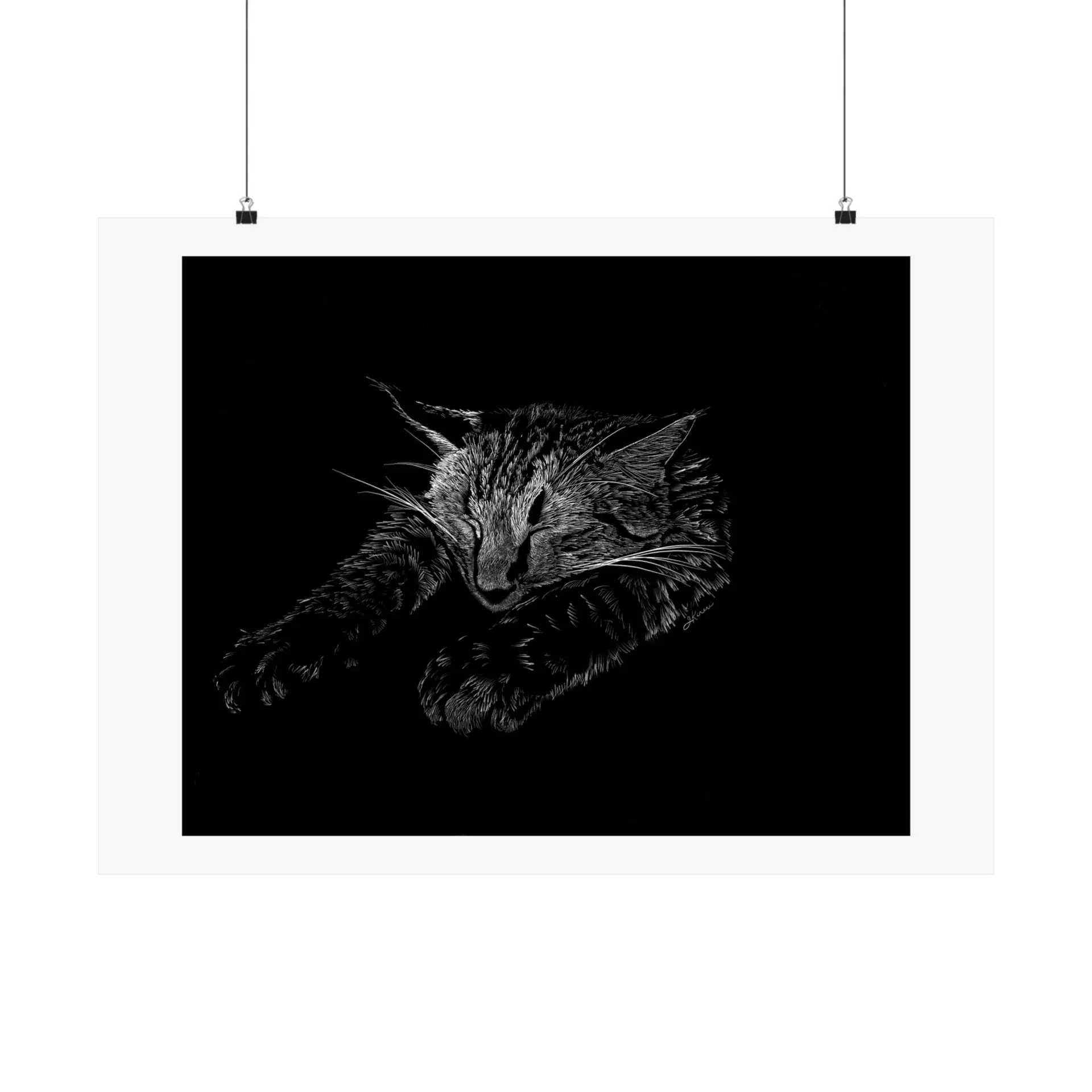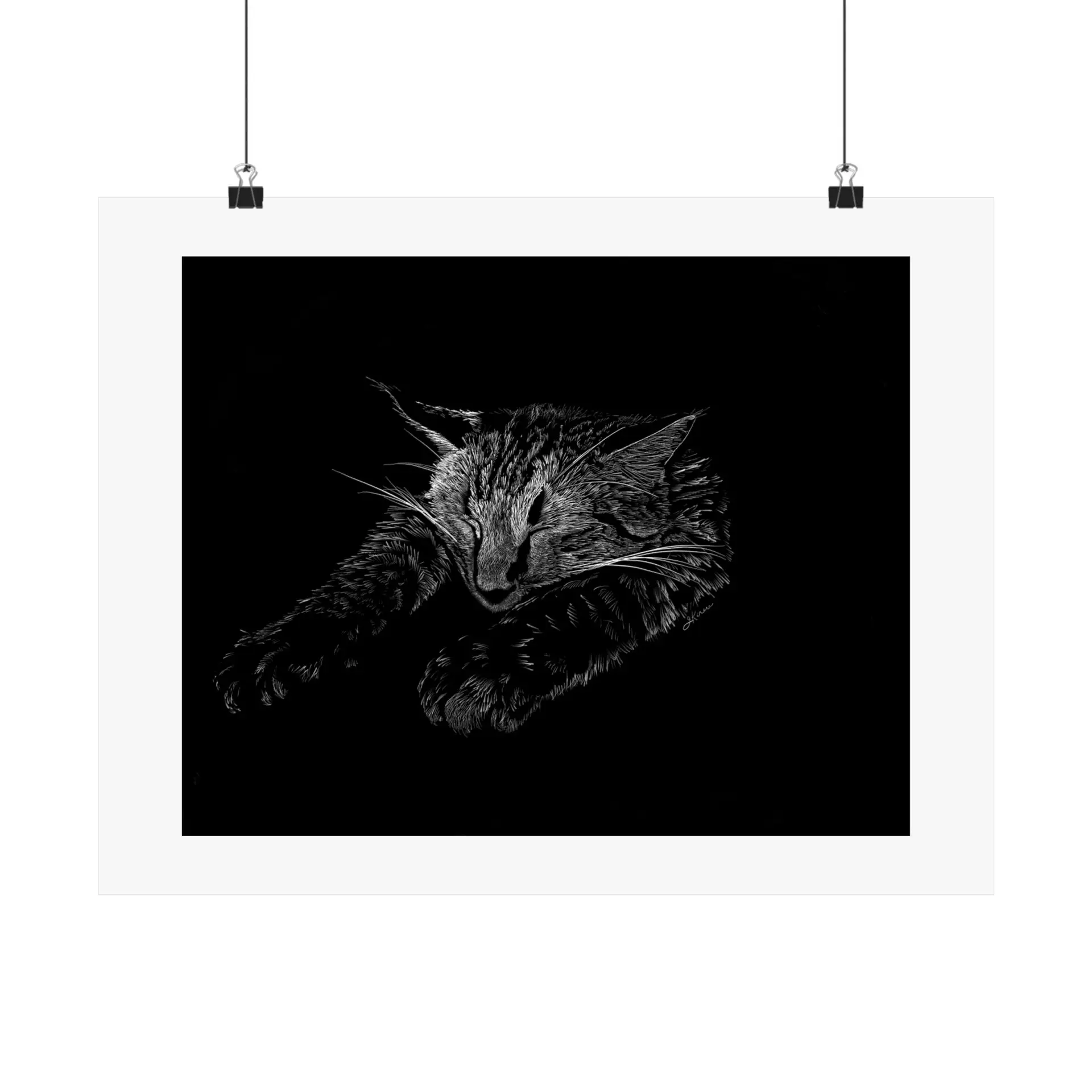 Printed on high-quality paper, this black and white design features the distinctive shape of a sleeping cat paw. The stark contrast and clean lines make for a powerful visual that resonates with cat lovers and art enthusiasts alike.