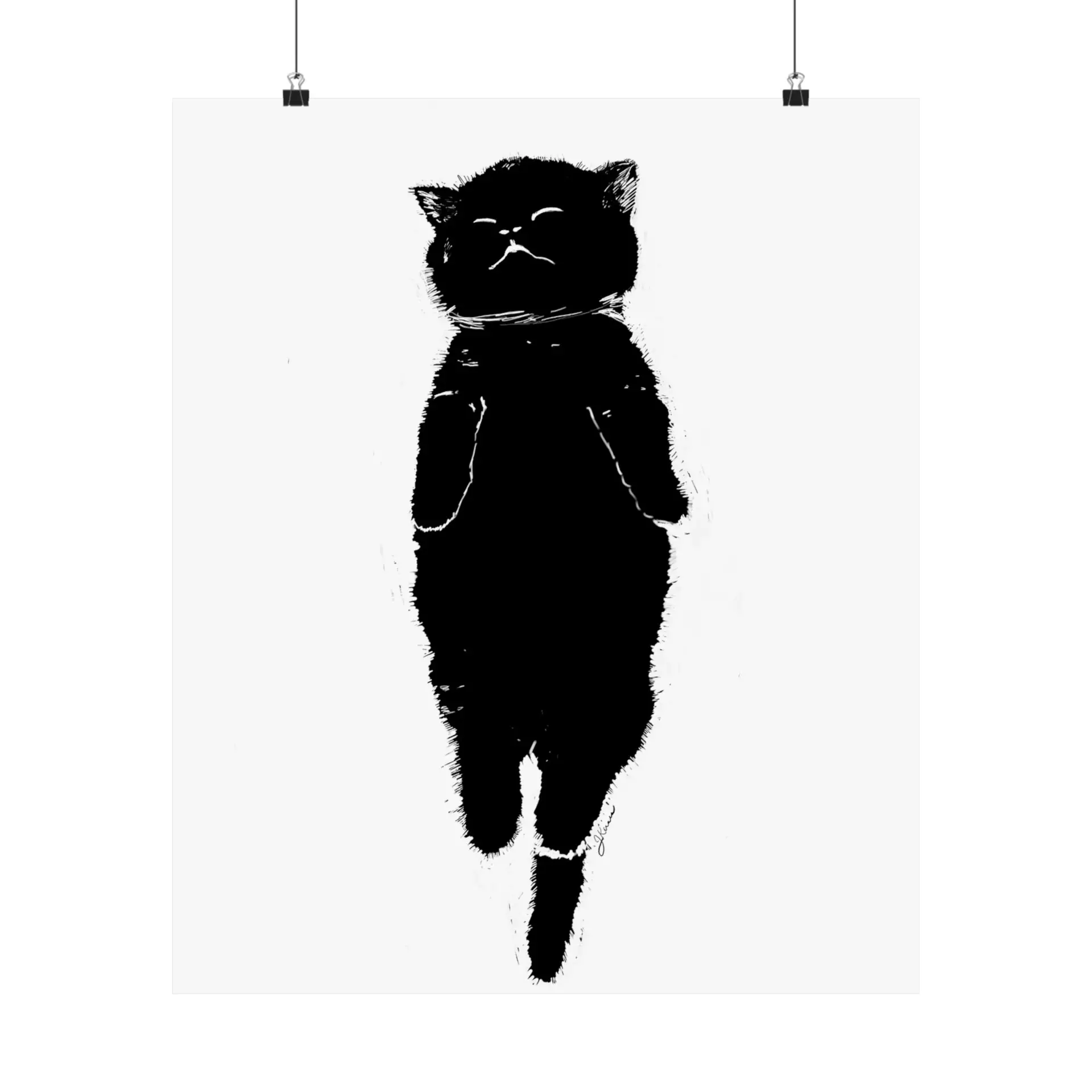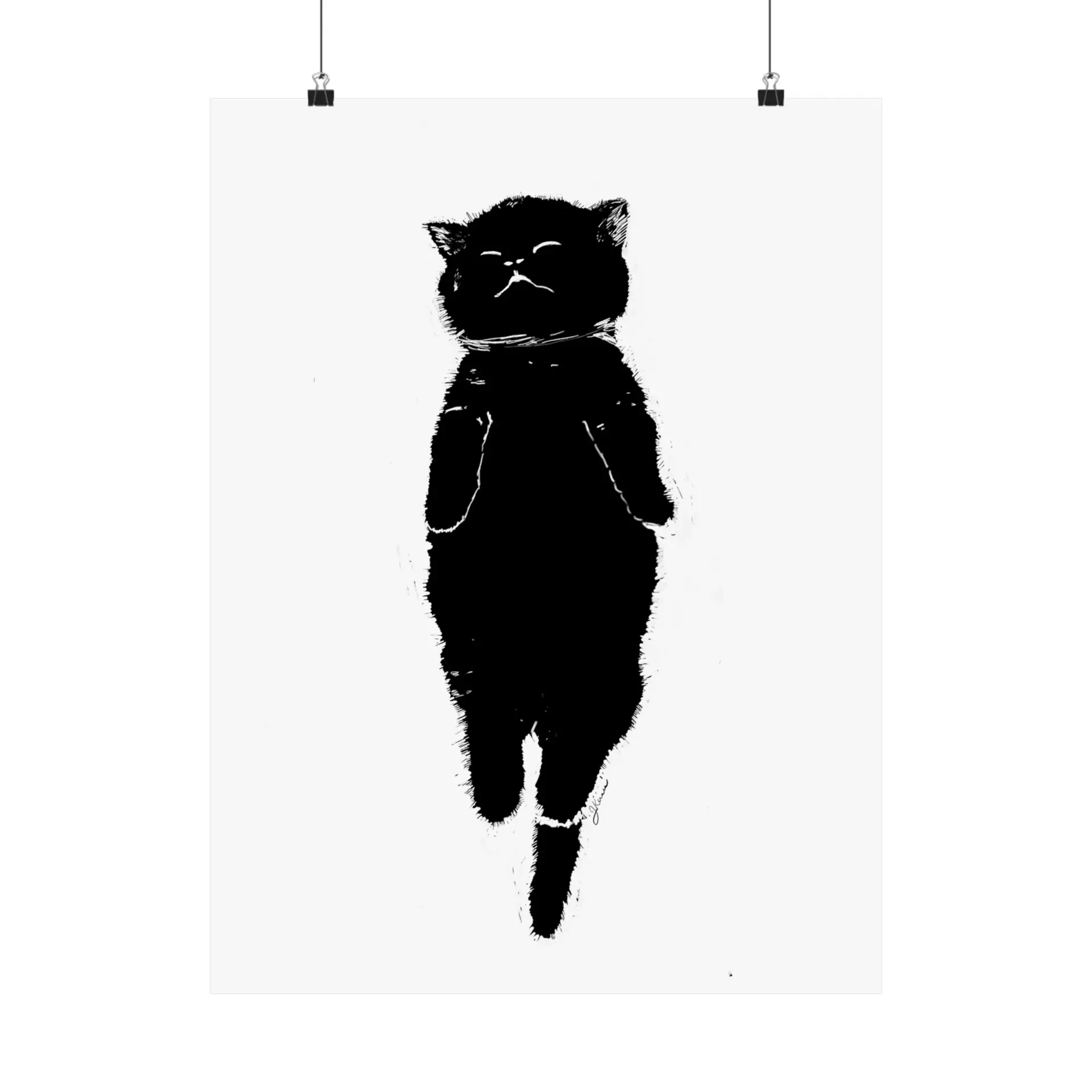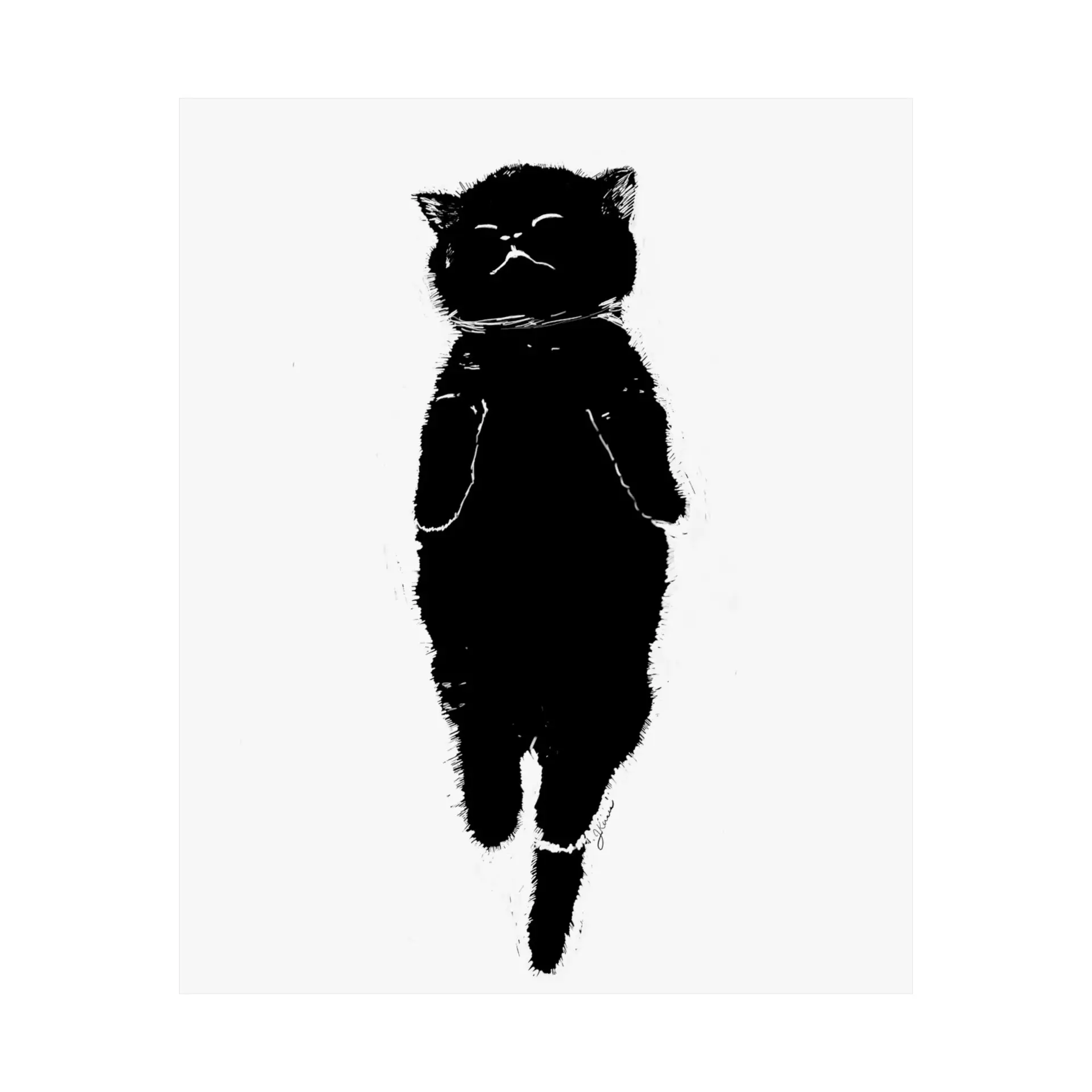 Printed on high-quality paper, this black and white design features a contented cat backward for a nap, as kitties do. The bold lines and contrasting shapes create a striking visual that works well in various decor styles.