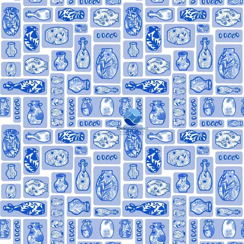 The first design, the Blue Bodrum Pottery Pattern, is inspired by centuries-old traditions of Mediterranean ceramics. Decorative vases, jugs, and vessels are reimagined with floral and organic motifs, carefully arranged in a seamless repeat. This pattern honors the handcrafted artistry of Turkish Iznik tiles and Greek ceramics, but presents it with a fresh, contemporary composition. Ideal for statement wallpaper or fabric, it infuses any space with history, craftsmanship, and visual richness.