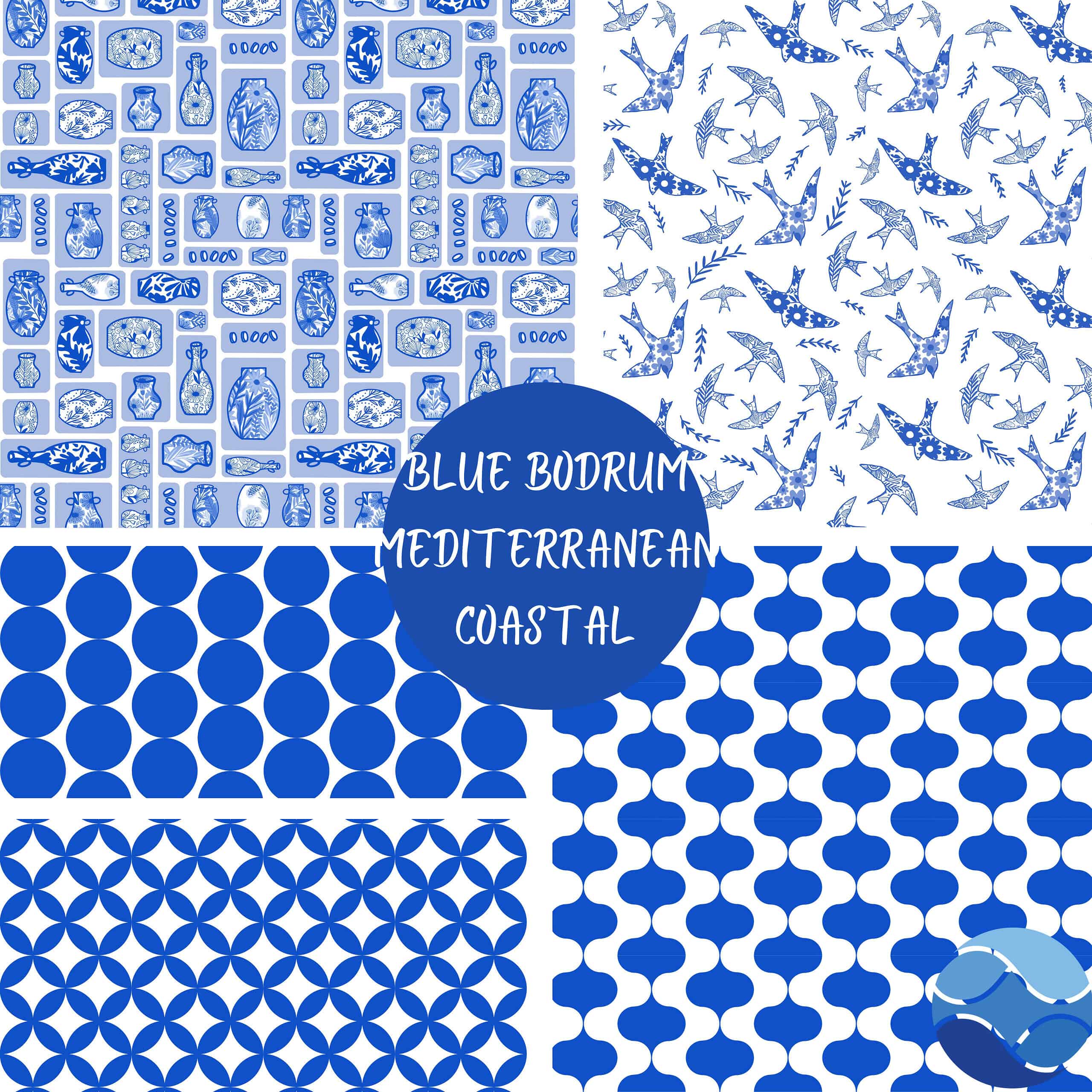 The Blue Bodrum Mediterranean Coastal Patterns mini collection brings together the essence of coastal living, timeless tradition, and artistic design in one unified set. Inspired by the sun-soaked beauty of Bodrum and the wider Mediterranean region, this collection is defined by its signature blue-and-white palette — a color combination that symbolizes sea, sky, and simplicity. From decorative pottery to bold geometrics and playful birds, each design reflects a unique facet of Mediterranean life, while together they form a story of artistry and elegance.