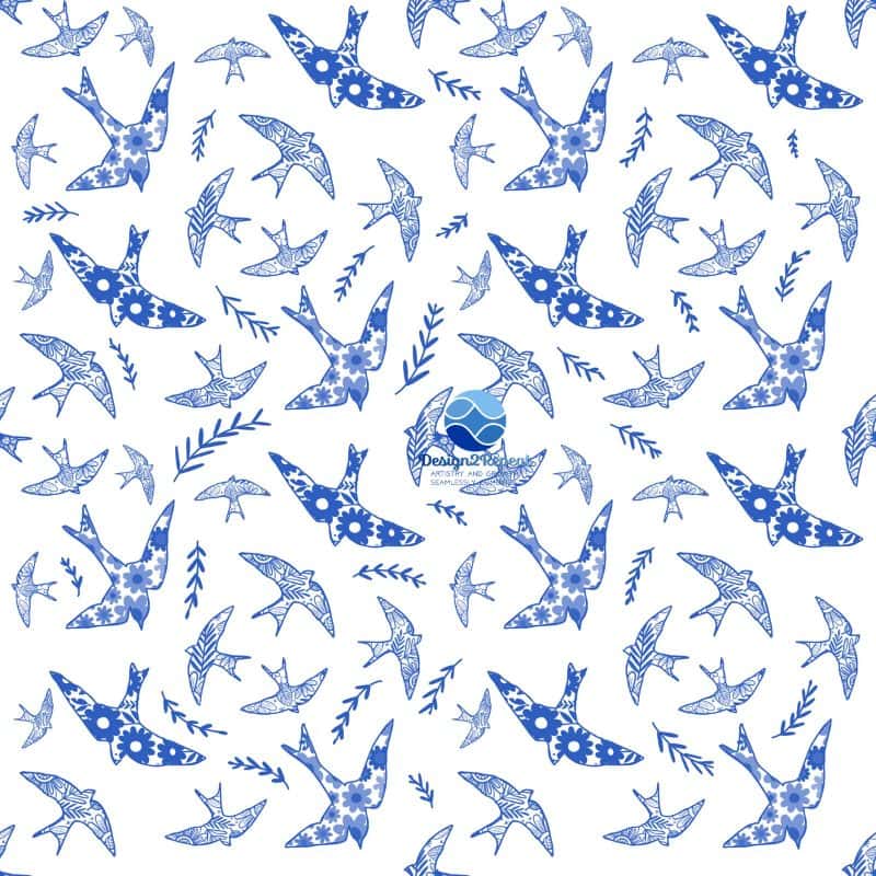 Adding a sense of life and playfulness is the Swallows in Flight pattern, a design filled with dynamic, hand-drawn birds. These swallows, adorned with floral and geometric motifs, reference Mediterranean folk art and the freedom of coastal life. Their scattered arrangement creates a light, breezy repeat that works beautifully for children’s rooms, airy textiles, or wallpapers meant to bring a touch of whimsy into a space.