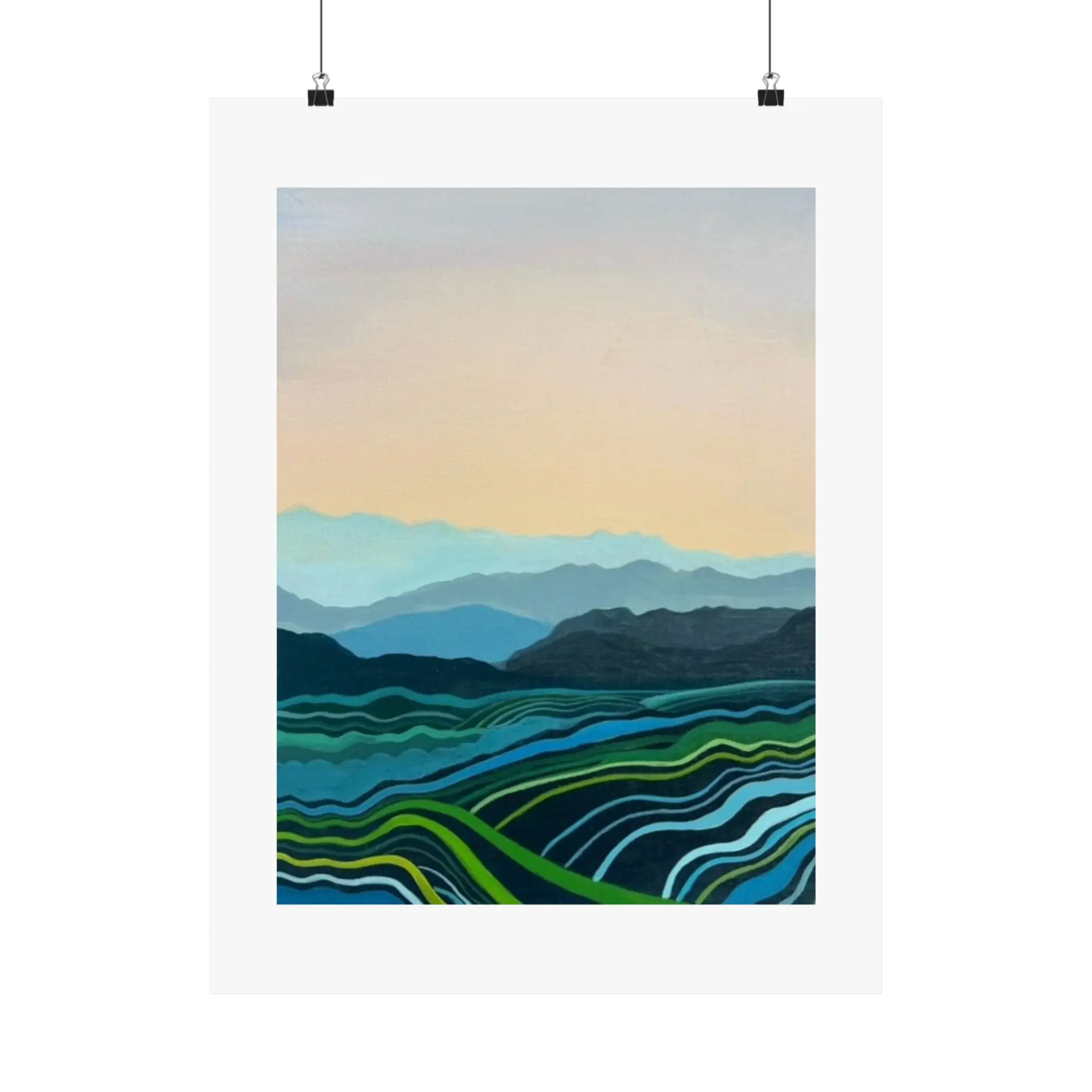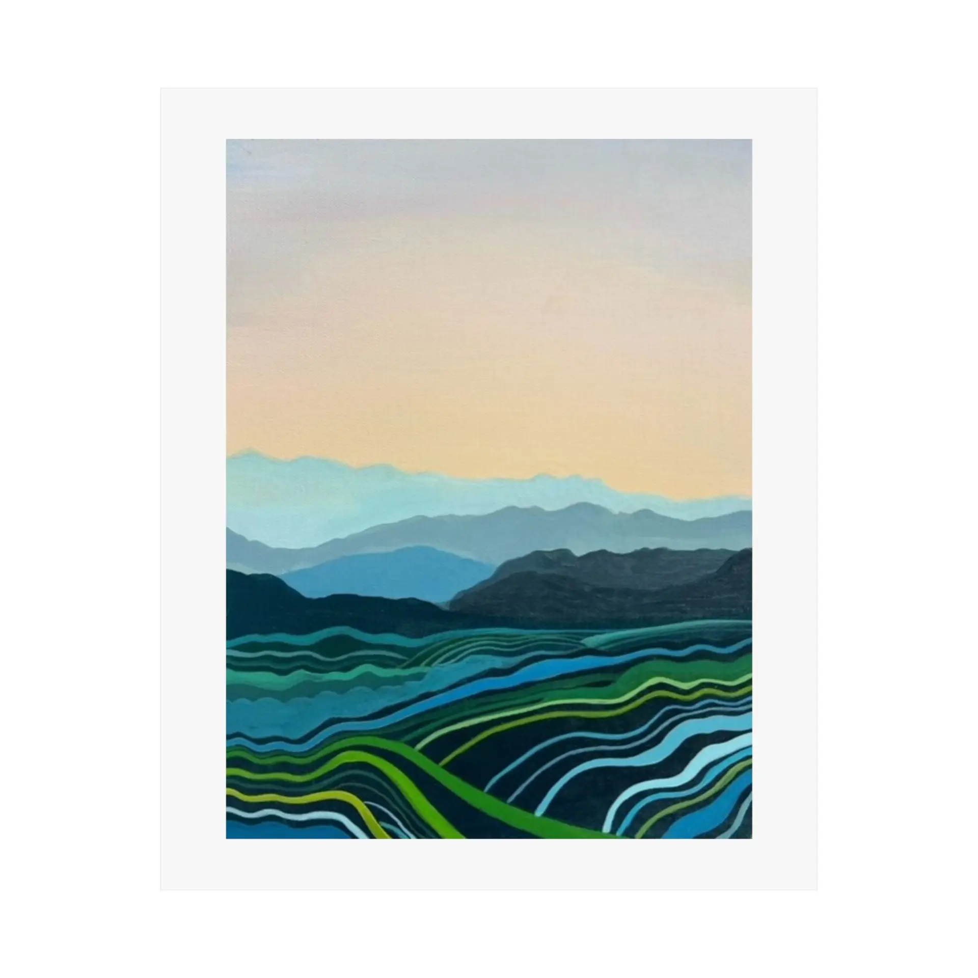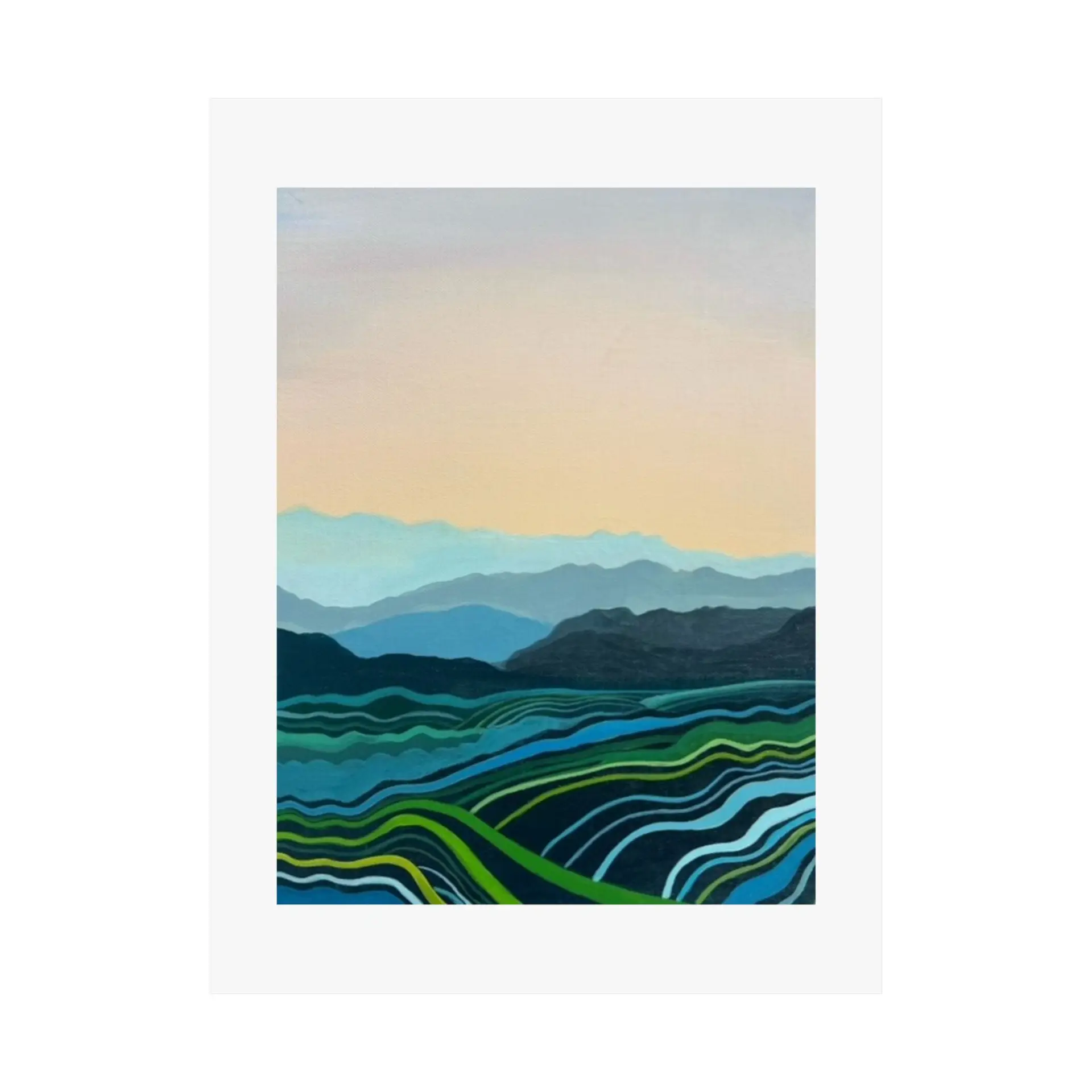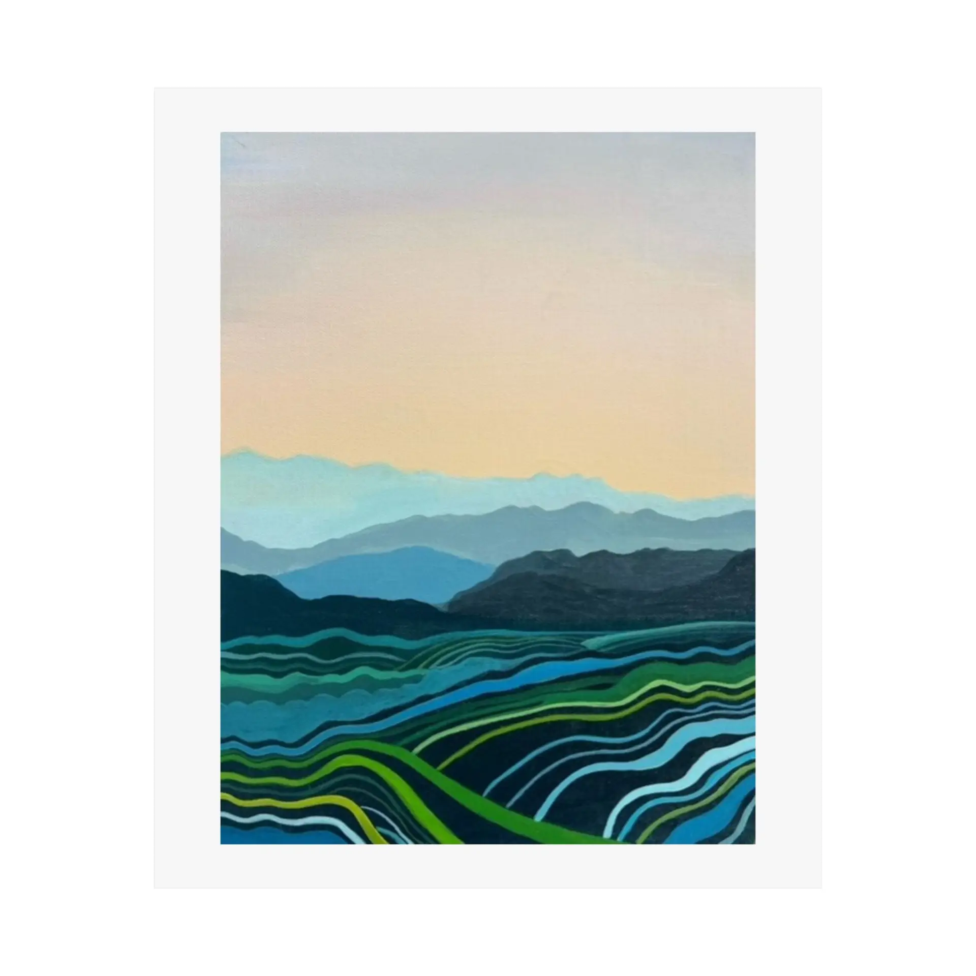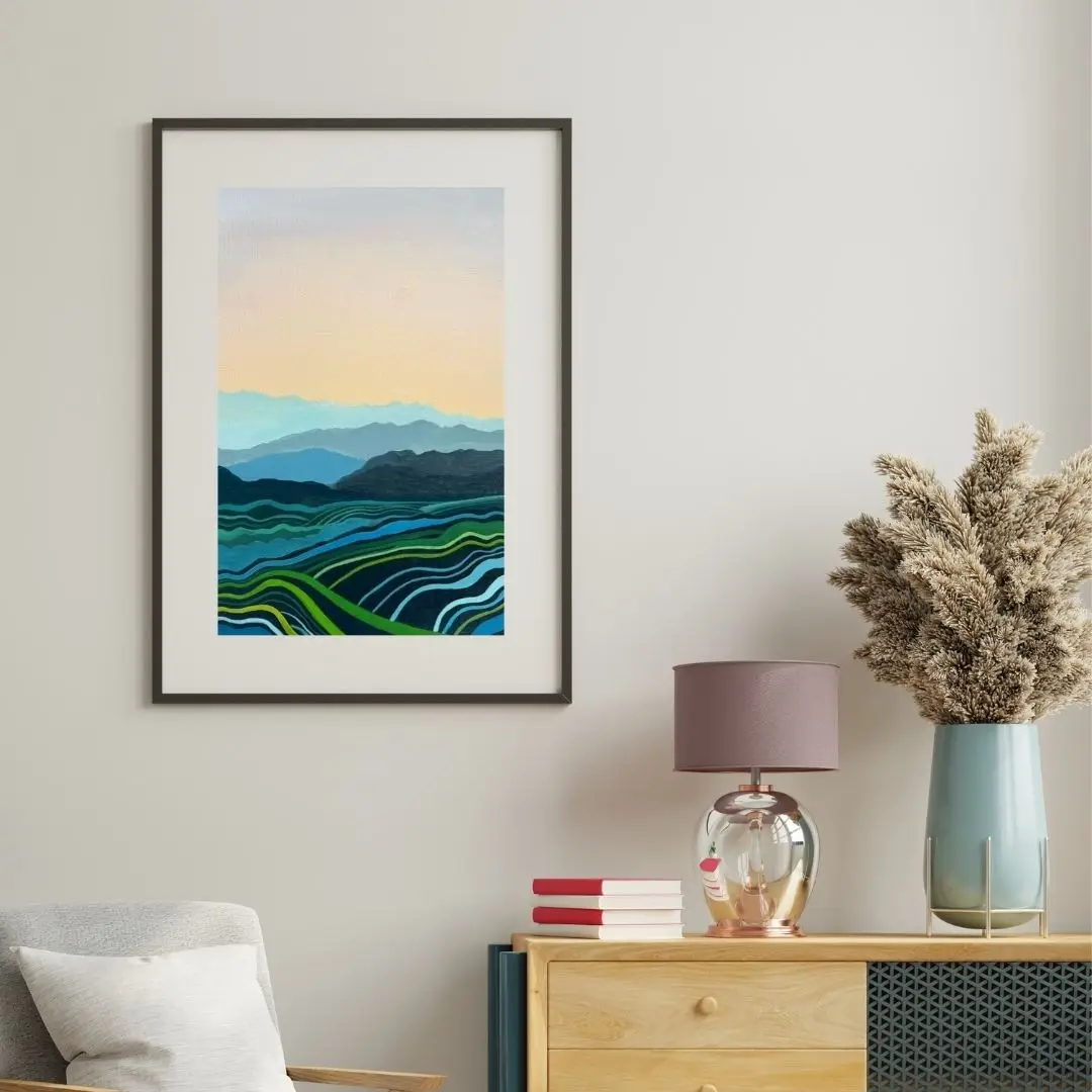 This Blue Mountains print adapts beautifully to various settings. It can create a serene focal point in a busy living room, add a touch of nature to a bedroom, or bring a sense of expansiveness to a small space. The print is also perfect for offices, helping to create a calm work environment.