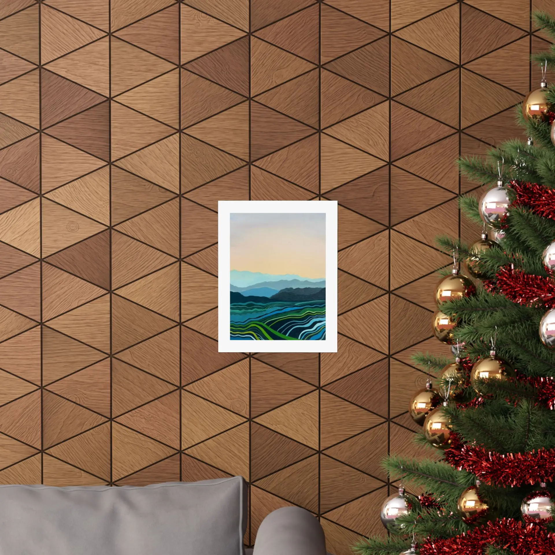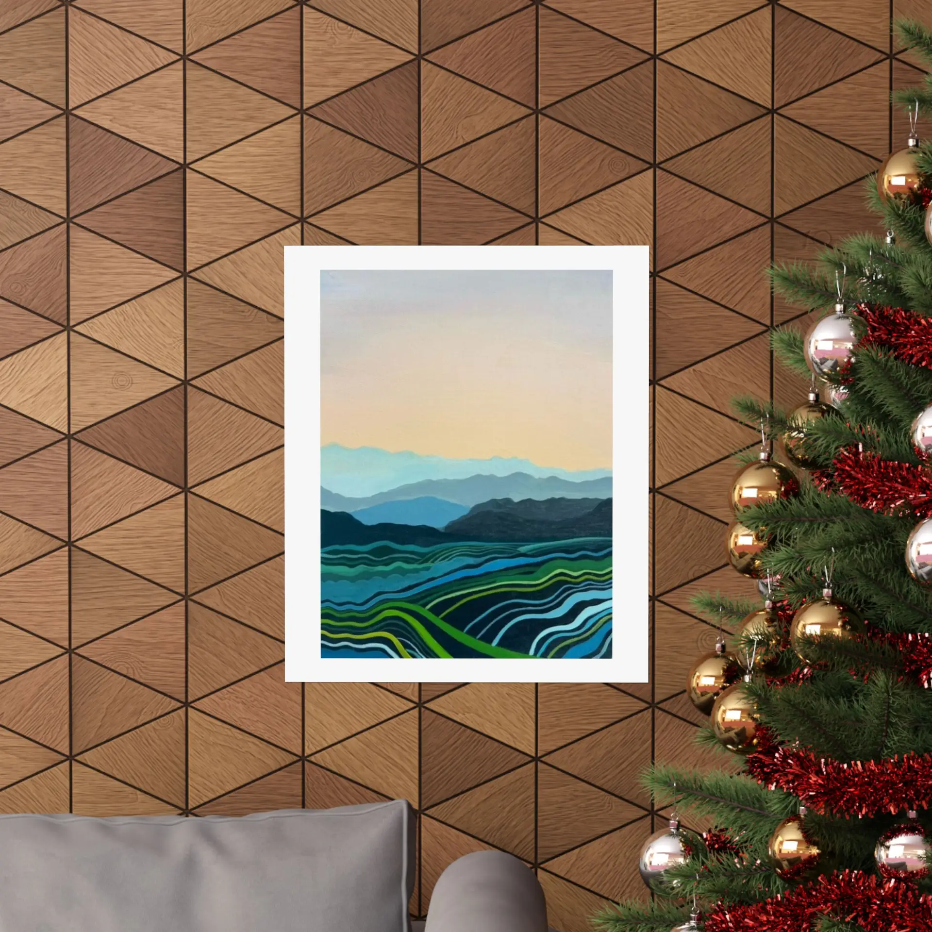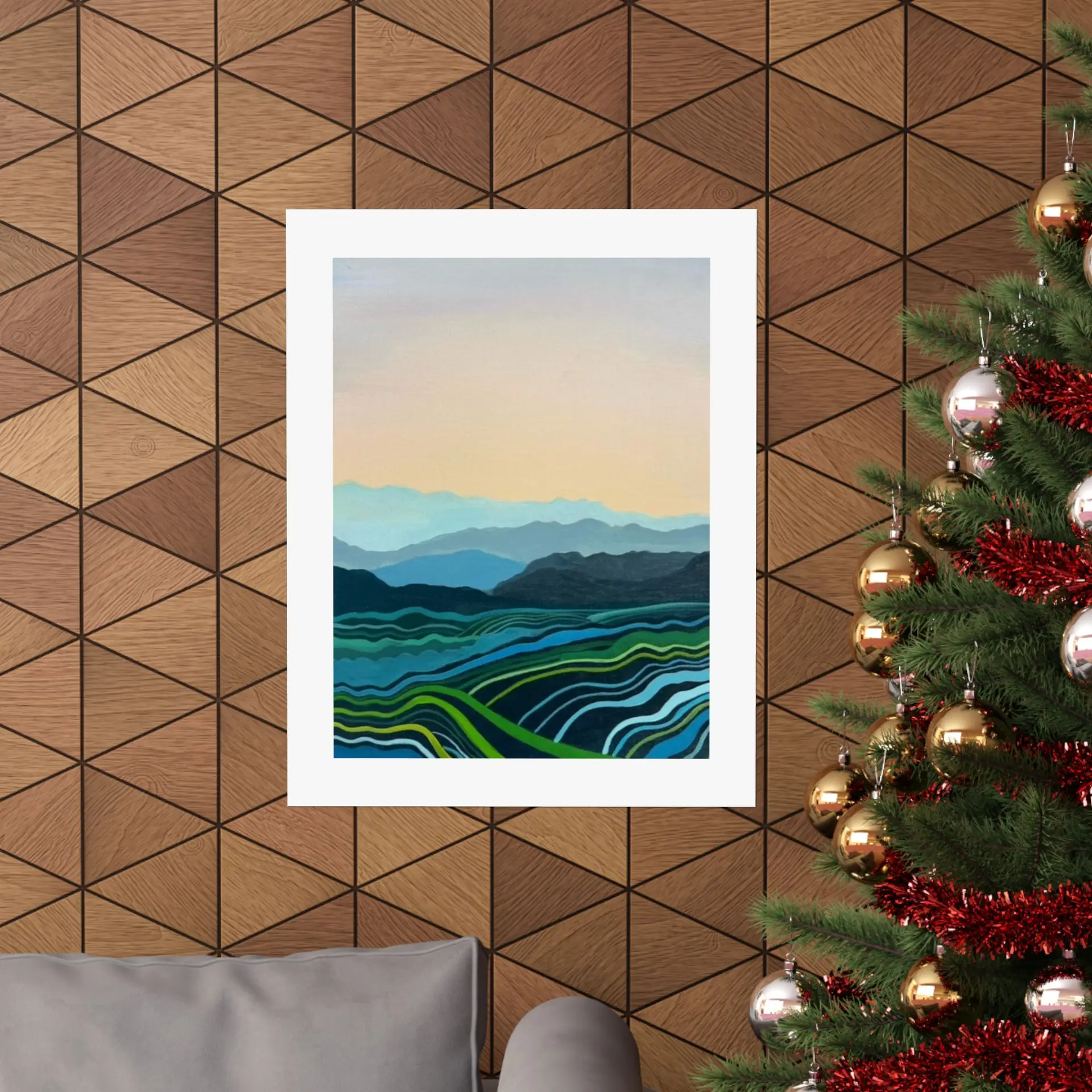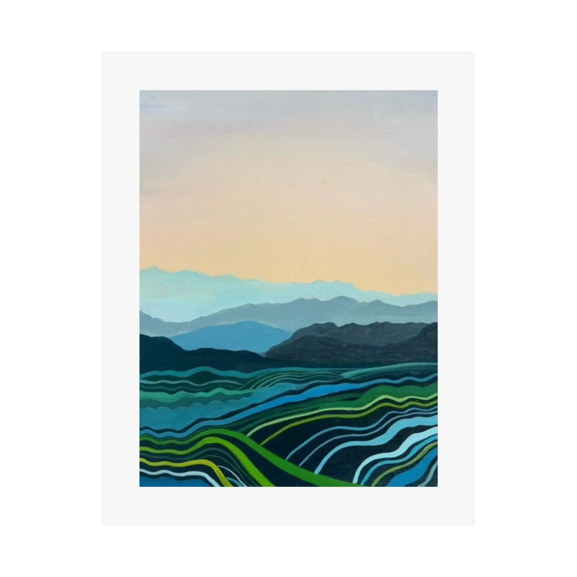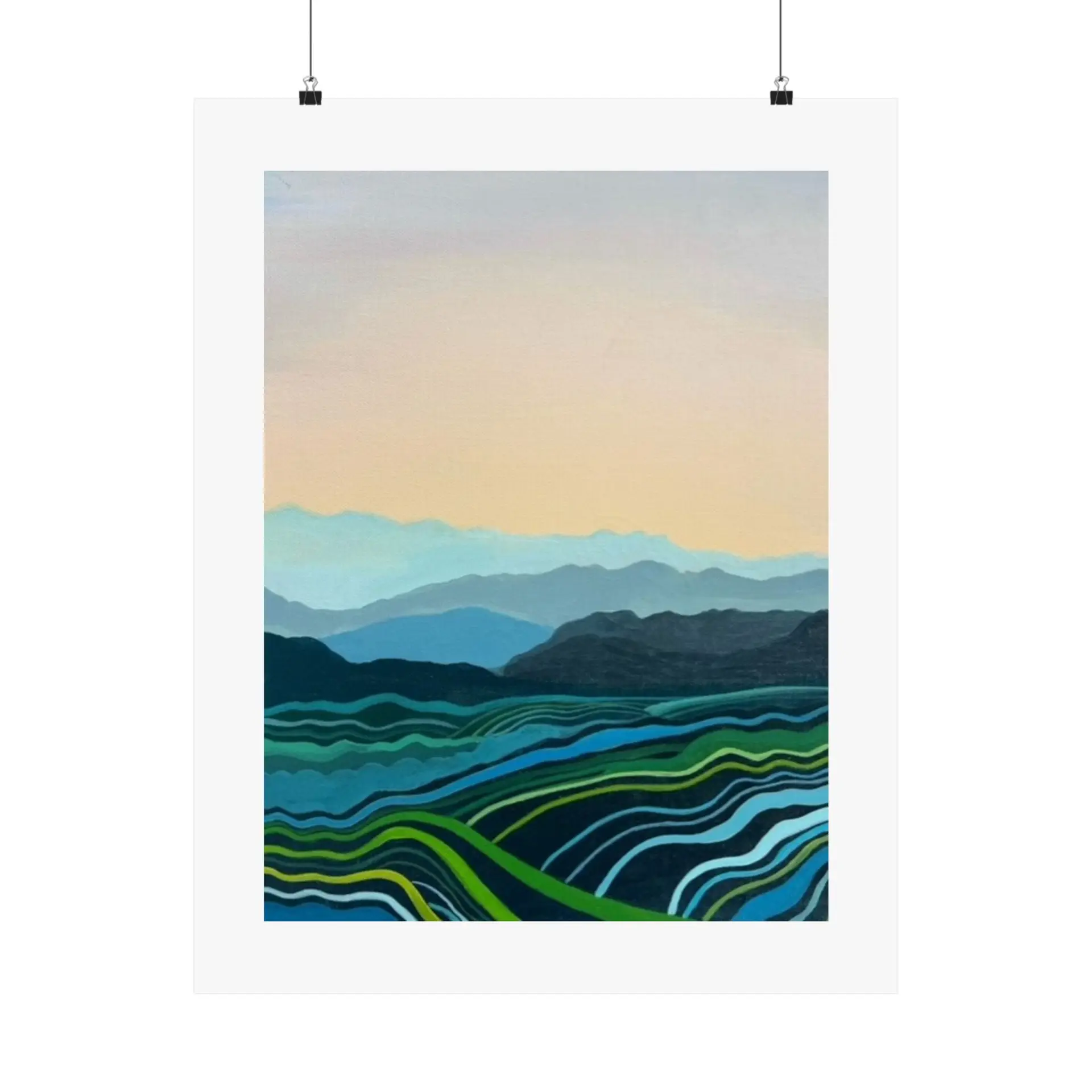 This Blue Mountains print adapts beautifully to various settings. It can create a serene focal point in a busy living room, add a touch of nature to a bedroom, or bring a sense of expansiveness to a small space. The print is also perfect for offices, helping to create a calm work environment.